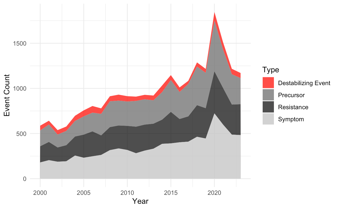 We are excited to announce that Version 7 of the Democratic Erosion Event Dataset (DEED) has now been published! The new version of DEED includes 23,421 event observations related to democratic erosion and autocratic consolidation across 156 countries from 2000 to 2023. DEED v7 classifies events into 76 distinct categories across 4 event types (precursors to, symptoms of, and resistance to erosion, and destabilizing events in authoritarian regimes).