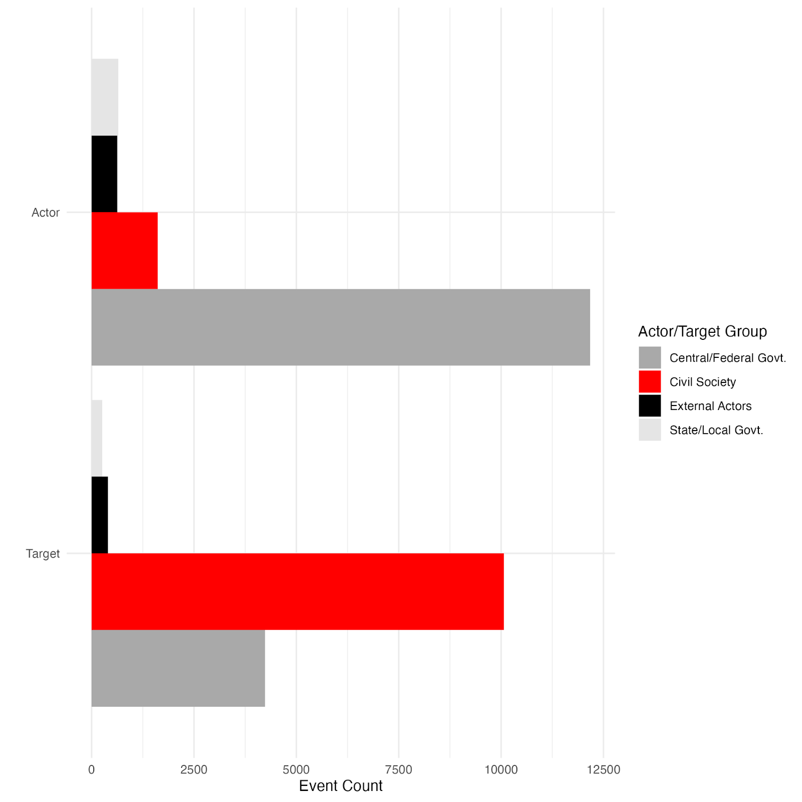 Actors and targets are grouped into Central/Federal Level government actors and institutions (i.e. Heads of State, legislature, Supreme Court); State and Local Level government actors and institutions (i.e. mayors, local governments, local courts); Civil Society (i.e. social movements, journalists, business actors); and External Actors (i.e. foreign countries, international organizations). (You can see the full list of all actors/targets in the DEED v7 codebook.) Figure 1 shows the number of events by different groups of actors and institutions for both the target and actor variables, across the symptom and precursor event types. The figure shows how central or federal level politicians and institutions are driving the precursor and symptom events in the dataset, whereas civil society is the target of those events.