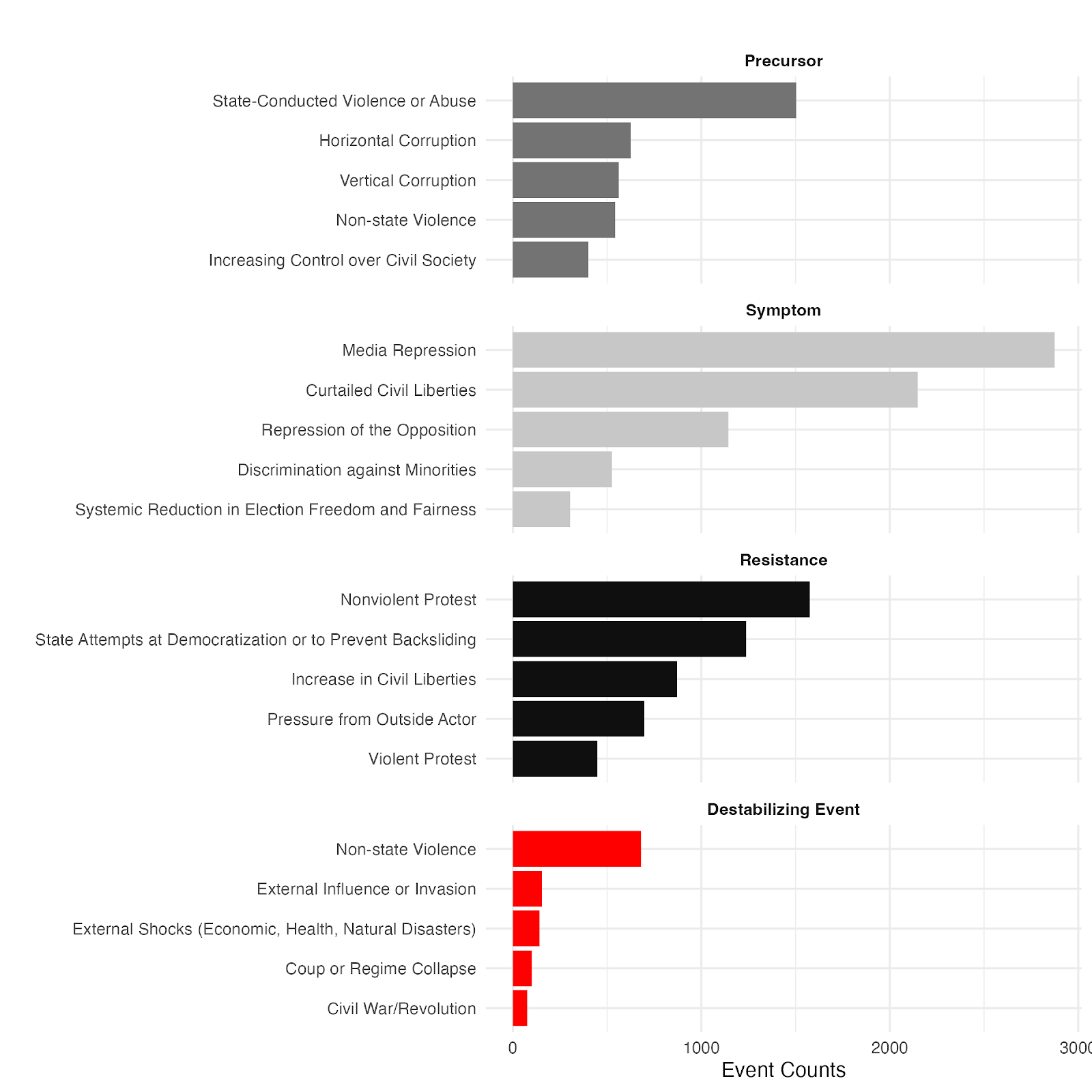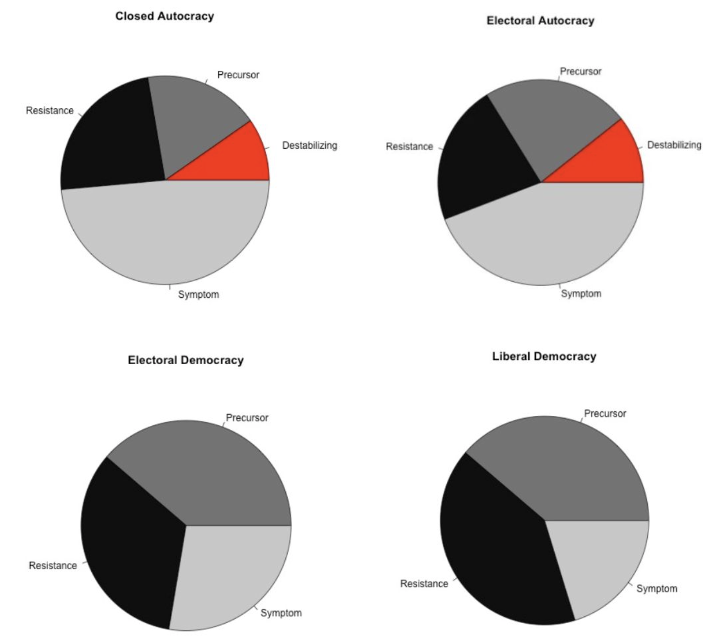 The distribution of event types varies by regime, which offers insight into how erosion can manifest depending on a country’s political environment. Symptom events (shown in light grey) are most common in the two more authoritarian regime types (closed autocracy and electoral autocracy), while precursors (dark grey) are more common than symptoms in the two democratic regime types (bottom row). Figure 3 also shows how democracies tend to have higher levels of resistance events (shown in black) than more closed regimes.