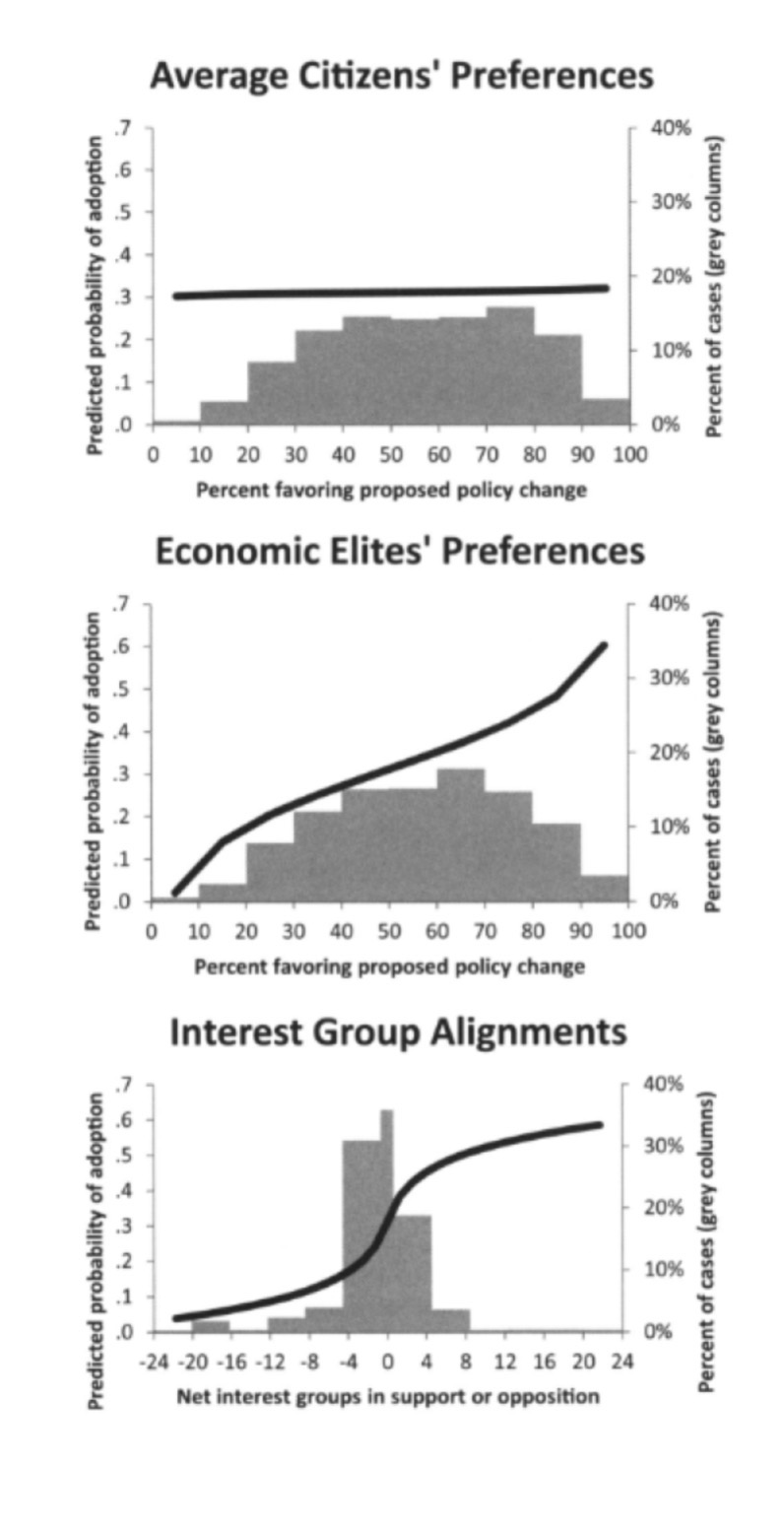 In the 2014 paper “Testing Theories of American Politics: Elites, Interest Groups, and Average Citizens”, Martin Gilens and Benjamin I. Page found that there is a very weak correlation between public opinion on a given policy and the said policy’s chance of passing. A much stronger correlation was found between policy success and economic elite opinion or interest group opinions. This suggests that people who are voting aren’t making much of an effect as their opinions have much less sway over the representatives than the opinions of the elite.