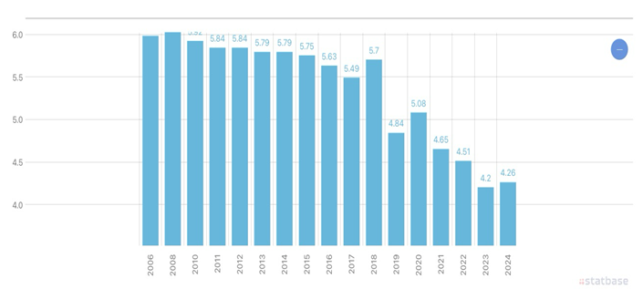 This is total reserves (includes gold, current US$) – Bolivia. This indicators that in 2013 was the peak of Bolivia’s resource-dependent economy, which heavily depends on the country’s natural gas exports. At this time, the Morales government nationalized the gas industry and paid high taxes to foreign companies by promoting resource nationalism. In the beginning, inclusions succeeded, such as lowering the poverty rate due to the abundance of state coffers. However, due to excessively high taxes and regulations, foreign companies stopped exploring new gas fields or investing in technology. As a result, the existing gas fields are aging, and production has halved compared to 2014.