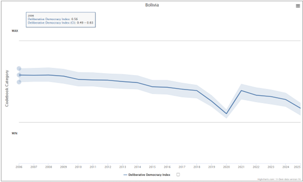 This indicator reveals Bolivia’s index of liberal democracy from the beginning of Morales’s presidency in 2006 to 2024. When social rights expanded in the early days of power, the index was high. However, as the Morales government gradually solidified its power using a judicial review, the figures decreased as the year passed. This can be seen that inclusivity paradoxically caused the weakening of liberalism.